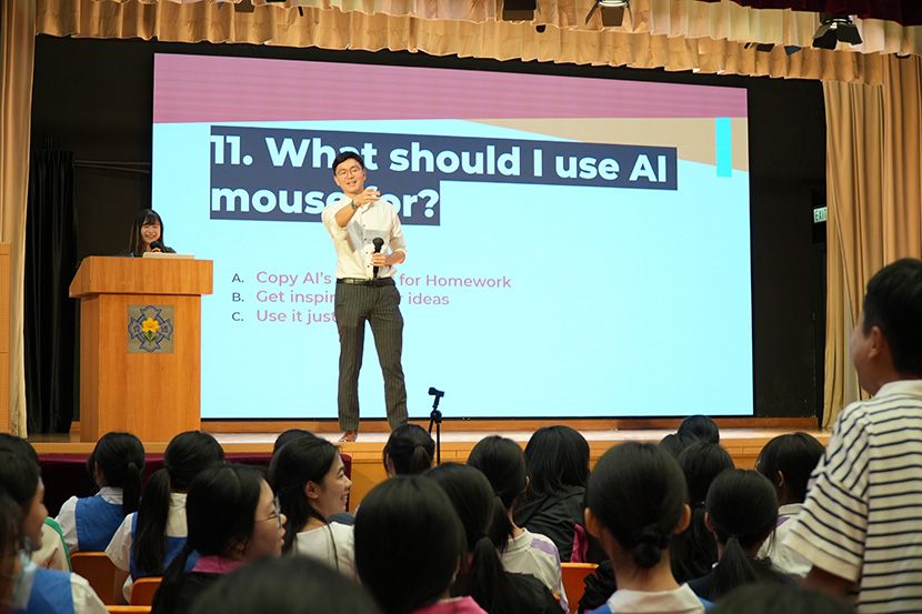 本校舉辦創科分享會,邀請 Cyberport University Partnership Programme Award 得主 Mark Ueno 主講。Mark 曾於創新科技比賽獲獎及完成海外交流。他分享研發 AI 智能滑鼠 的歷程及應用,鼓勵學生積極面對挑戰,勇於創新。活動中 Mark 捐出20多 部 AI 滑鼠贈予學生,以推動科技教育。同場亦邀請學姐 劉嘉明 分享成長經驗,勉勵學妹自律自信、努力向上。學生從中了解 AI 的實際應用及創科精神,獲益良多。