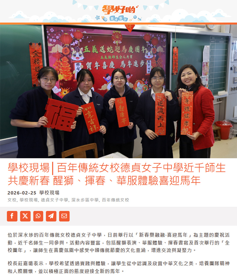 農曆新年臨近,位於深水埗的德貞女子中學舉辦以「新春樂融融‧喜迎馬年」為主題的三日慶祝活動,近千名師生一同參與。活動內容豐富,包括醒獅表演、華服體驗、揮春書寫及首次舉行的「全校團年」,讓師生在喜慶氛圍中感受中國傳統節慶的文化意涵,增進交流與凝聚力。
