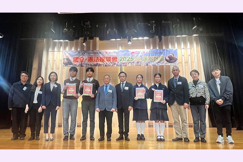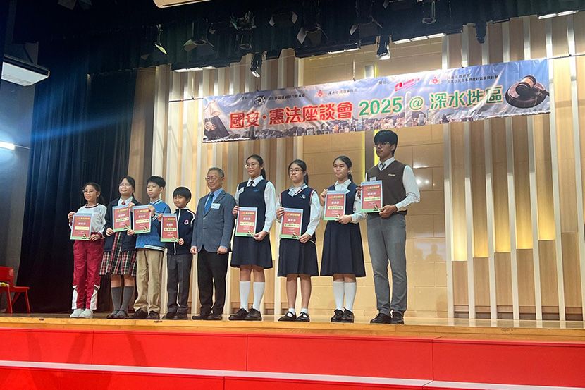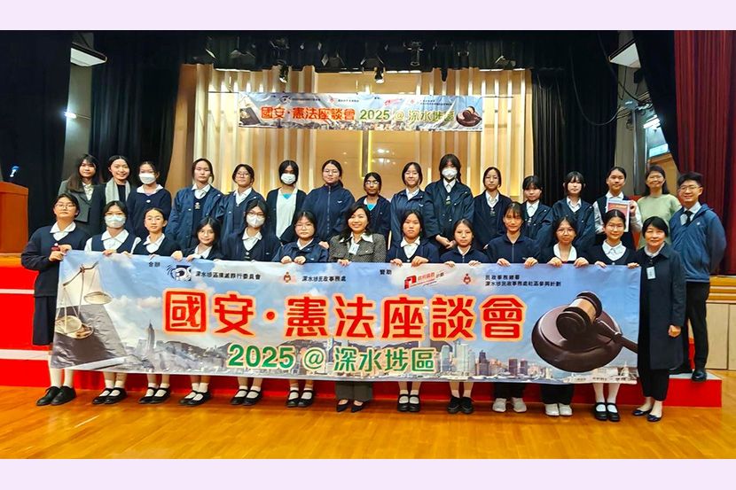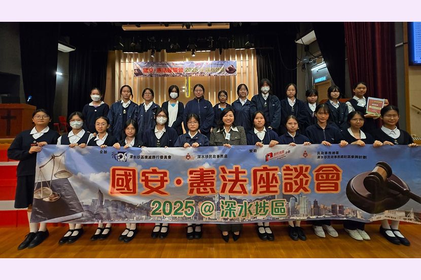 4/12/2025,深水埗區撲滅罪行委員會及深水埗民政事務處舉辦座談會,講解國家憲法及國安資訊,邀請區內中小學參加。由莊校長與洪嘉儷、黎志剛、王婉靖及劉苡喬四位老師,帶領領袖生及初中班風紀共24人參與。二智楊雅喬、四智關鈺螢獲邀擔任活動司儀。 同學認真聽講,踴躍參與問答環節。獲得紀念品外,更增進了對國家憲法、港區國安法和維護國家安全條例的認識;了解憲法和香港的關係,亦提升了維護國家安全的意識。