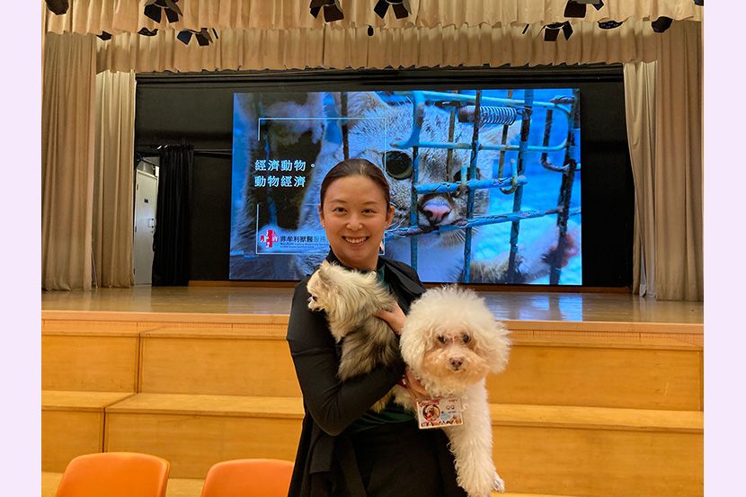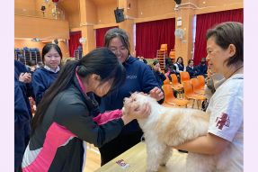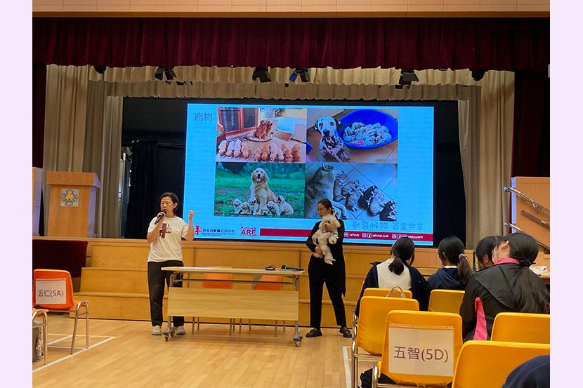 公民教育組於5/12聯同個發科為中五同學舉辦有關動物經濟的講座。當日除了邀請「非牟利獸醫服務協會」的代表,協助講解當動物涉及經濟利益時背後引申的種種問題外,還有兩位特別嘉賓到訪本校,分別是被遺棄的貴婦狗「QQ」及在繁殖場拯救出來的長毛芝娃娃「貝貝」。透過領養牠們的主人代為發聲,講述被領養前的悲慘遭遇及對餘生的影響。幸好兩位經過現任主人的悉心照顧後都過著幸福的生活。講座期間各同學都表現專注,完結後除了把握時間與兩位嘉賓互動外,更以輕柔的掌聲來歡送各位嘉賓,以免嚇怕兩隻可愛的小狗,盡顯同學細心體貼的一面。