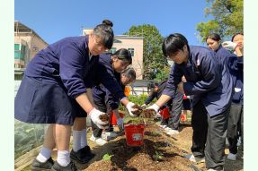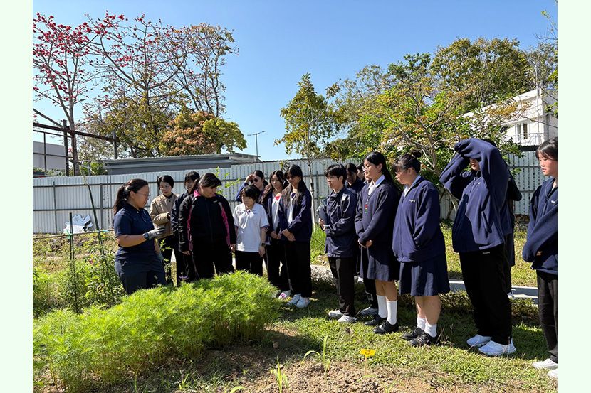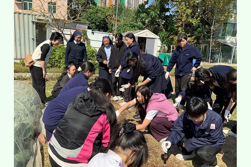當日,同學們首先抵達「寶血田園」,在莊修女的引領下學習靜心,感受大自然的生命力。在莊校長與莊修女的指導下,同學更親身嘗試以馬糞與雞糞為黃瓜苗施肥,於汗水中體會耕作的辛勞,領略天主創造的奇妙。