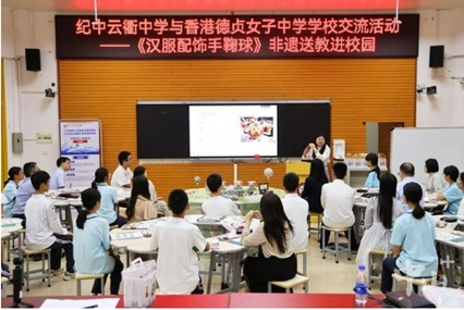當天下午,來自香港德貞女子中學的校長莊嘉璐帶領12名教師代表來到雲衢中學的錄播室,與該校的初中學生們一起感受蘊含中華文化元素的勞動課堂——《漢服配飾手鞠球》。在課堂上,來自沙溪理工學校的教師黃丹首先講解了手鞠球的歷史文化知識,然後通過多張精美的圖片展示了手鞠球的用途,最後講解手鞠球的圖案設計和針法技巧。